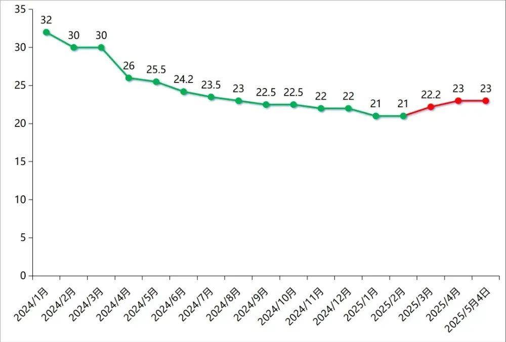 截至2025年5月4日的国内氯虫苯甲酰胺原药价格走势单位:万元/吨 数据来源:中农立华原药