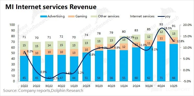 2025 年第一季度小米互联网服务业务实现营收 91 亿元,同比增长 12.8%,增速有所回落。本季度主要的增长驱动还是在广告上: