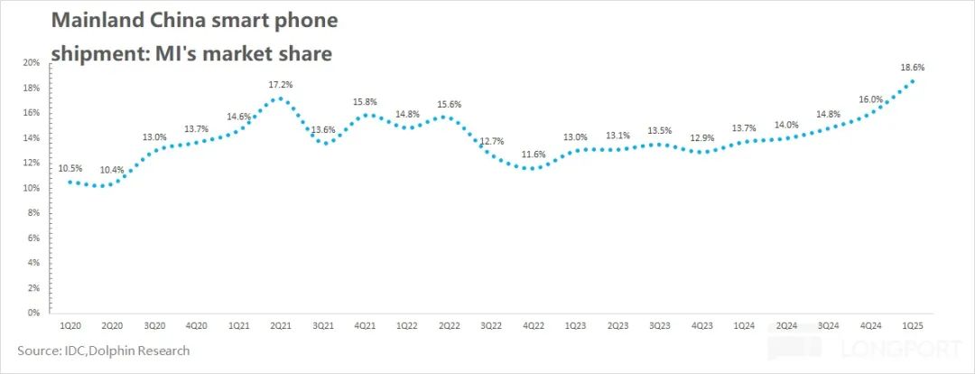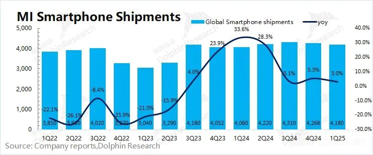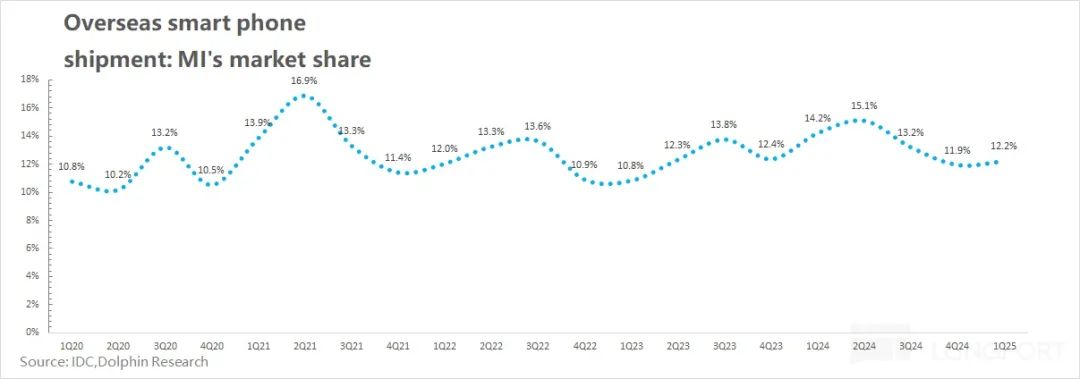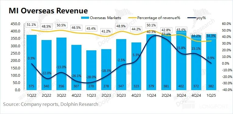 2025 年第一季度小米海外收入 382 亿元,同比增长 0.9%,在国内市场国补政策发力以及小米汽车实现突破的情况下,公司把当前的重心主要放在国内市场,海外市场收入占比下滑至 1/3 左右。