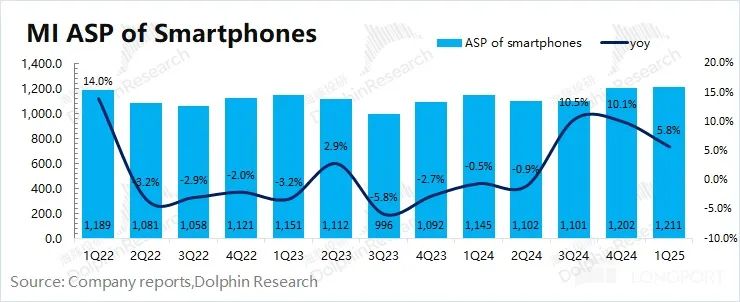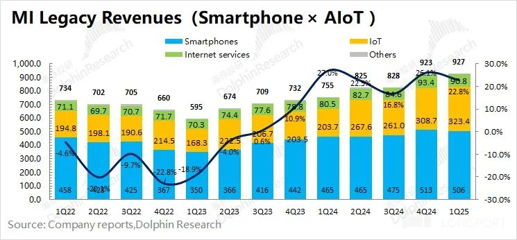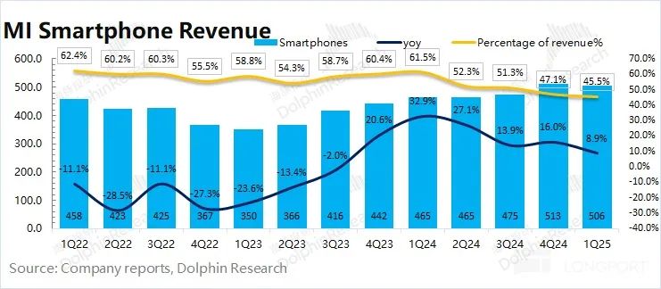 2025 年第一季度小米智能手机业务实现营收 506 亿元,同比增速回落至 8.9%。一季度即使在国补发力的情况下,手机业务的增速仍出现回落,主要是受海外手机业务的拖累。