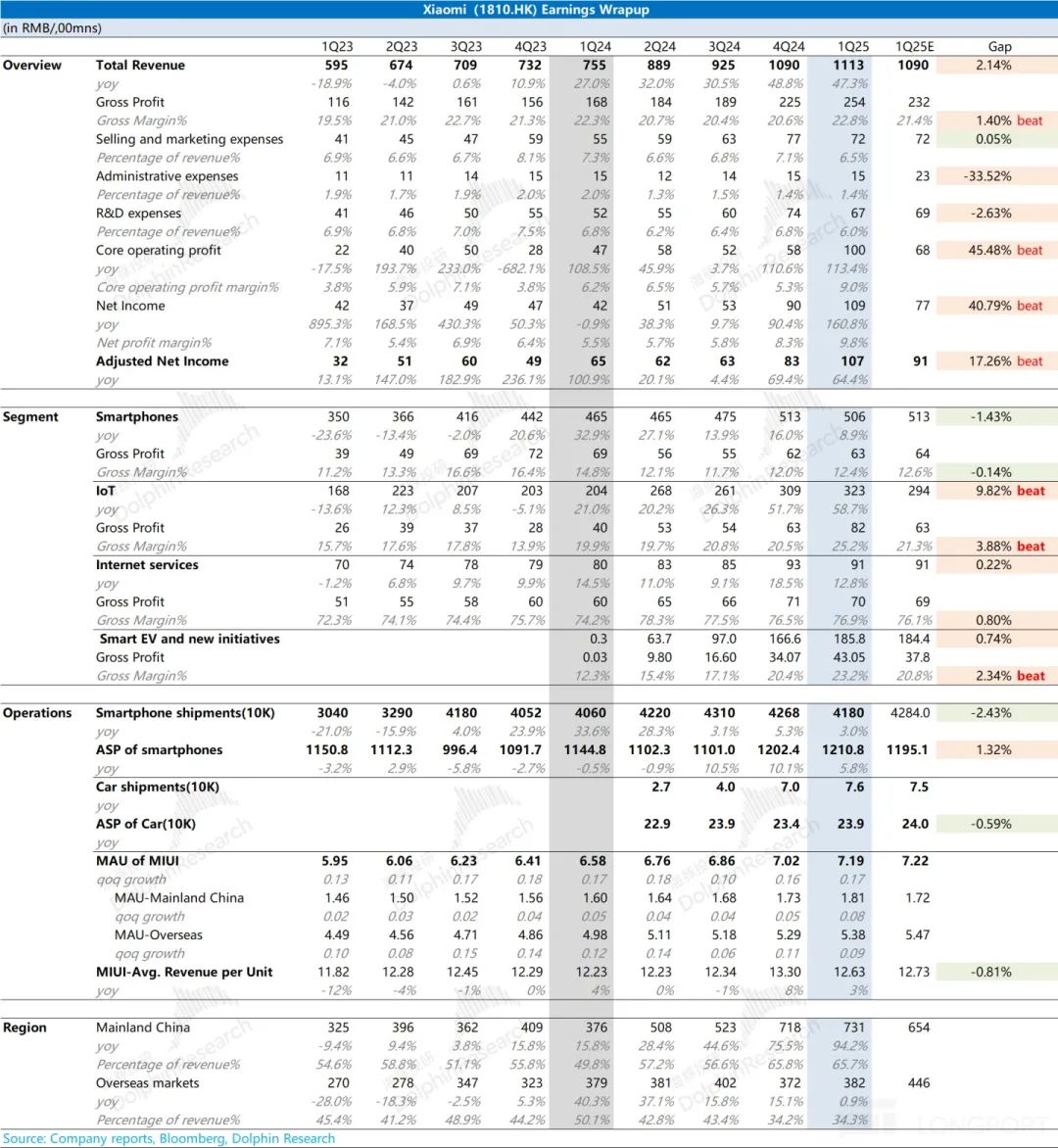 小米集团 2025 年第一季度总营收 1113 亿元,同比增加 47.3%,好于市场预期 1090 亿元。公司本季度增长主要是靠 IoT 和汽车,但真正超市场预期的是 IoT,汽车方面的收入应该是在预期之内。