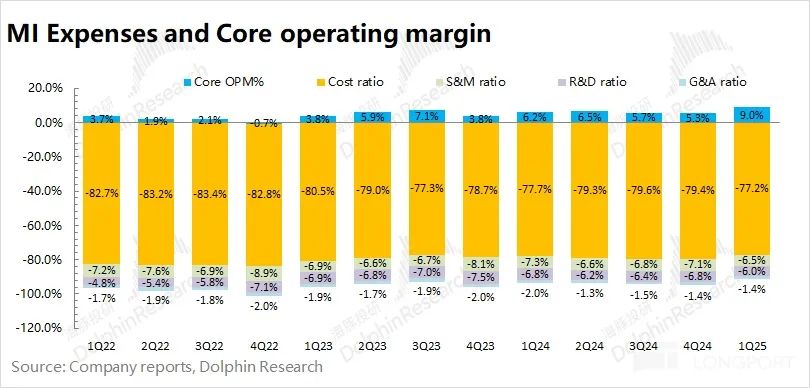2025 年第一季度小米三项费用合计 154 亿元,在收入高增的情况下,费用率环比回落了 1.4 个百分点。从分类来看,应该一部分是因为汽车业务导致的,汽车业务经营费用 48 亿。