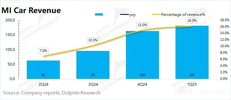 2)本季度小米的智能汽车等新业务实现营收 186 亿元,这主要还是对应 SU7 的销售。结合此前第三方统计的一季度销量来估算,公司汽车业务收入与预期基本相近。