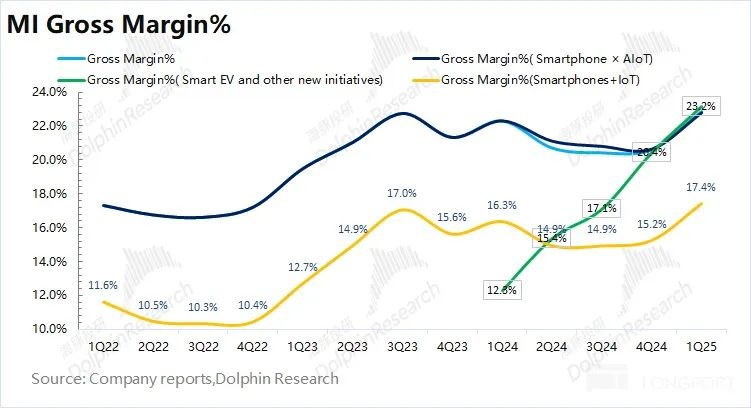 小米集团 2025 年第一季度毛利率 22.8%,明显好于市场预期的 21.4%。公司本季度毛利率的超预期提升,主要得益于 IoT 和汽车业务毛利率增长的带动。