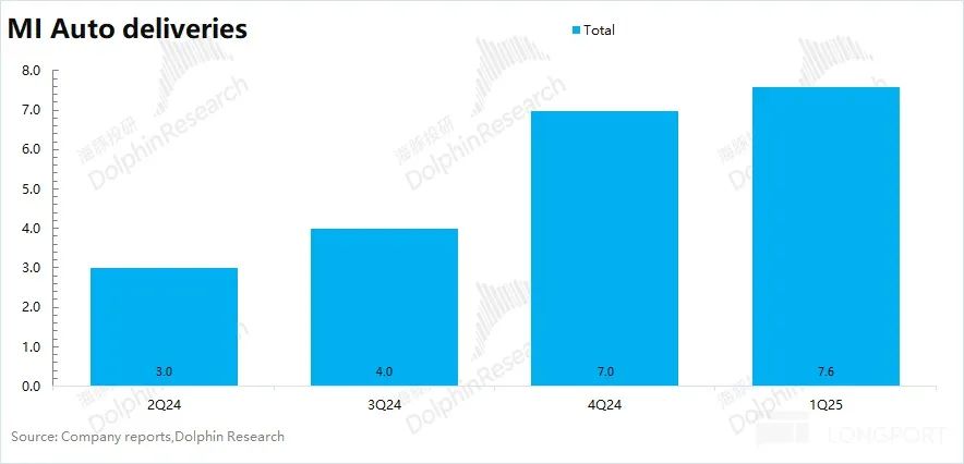 其中销量 7.6 万基本已知,单价 23.8 万,环比增长 2%。公司的 Xiaomi SU7 Ultra 在 2 月份上市,带动公司一季度汽车均价的提升。