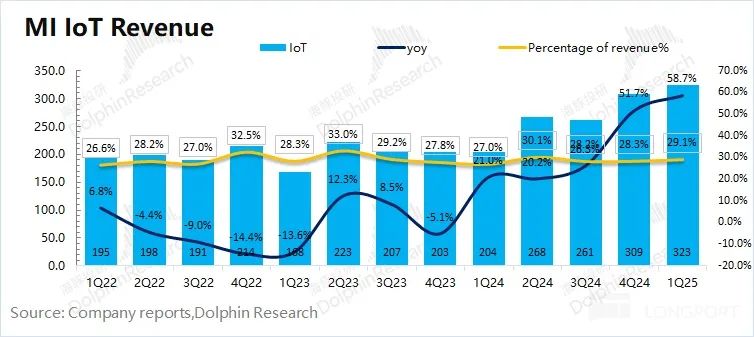 2025 年第一季度小米 IoT 业务实现营收 323 亿元,同比增长 58.7%。主要是国补带动平板等业务大幅增长,比如说平板业务在一季度收入环比增长 40%。大家电和可穿戴产品,也都能享受国补的助力。