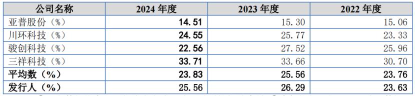 横向对比而言,世昌股份的主营业务毛利率与川环科技、骏创科技差异较小,高于亚普股份主营业务毛利率,低于三祥科技主营业务毛利率。