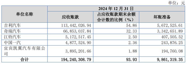 报告期内,公司前五大客户销售收入占营业收入的比重超过了92%,客户集中度较高。其中吉利汽车为公司第一大客户,报告期内公司对吉利汽车的销售额占营业收入的比重分别为47.89%、42.40%、50.45%。