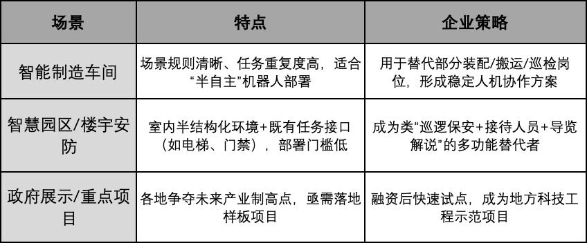 虽然“家庭助手”是人形机器人最诱人的终极想象,但我们更重视短期内可验证的商业路径。在To B/To G领域,我们发现三类典型应用已经开始落地,并具备融资讲故事与验证技术的双重价值: