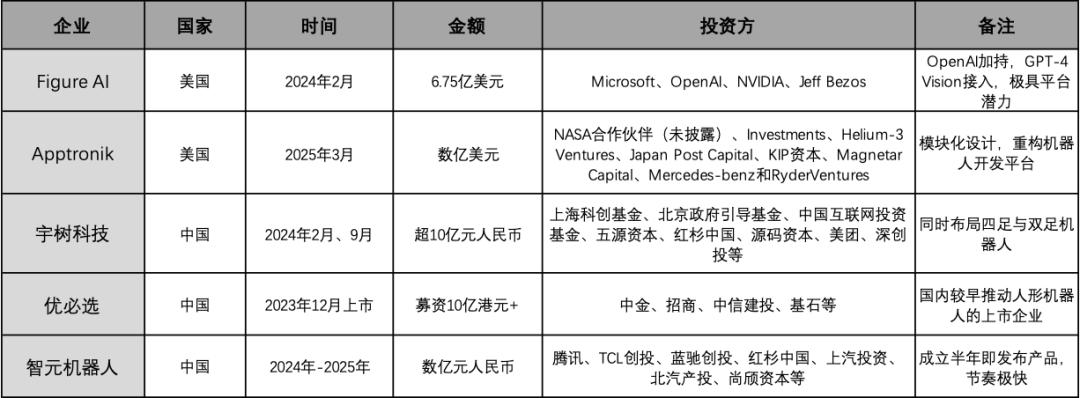阶段变化:2022年前,人形机器人融资主要集中于伺服电机、感知系统、仿人结构等硬件技术,规模较小;而自2023年Figure AI、特斯拉等产品频繁亮相后,资本热度迅速提升,融资重心转向“整机能力+通用智能融合”的公司。