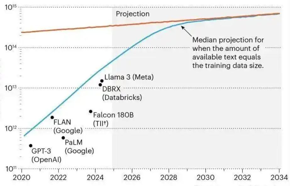 Pablo Villalobos的论文估计,训练大模型的数据将于2028年耗尽