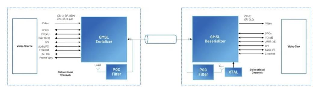 在实际应用中,它通过单根同轴电缆或屏蔽双绞线电缆同时传输电源、双向控制数据、以太网、双向音频和多路单向视频流。GMSL 串行器从标准数字视频接口(例如HDMI、DisplayPort、摄像头串行接口(CSI-2) 或显示器串行接口(DSI))接收视频,并可通过长达 15 米的电缆传输视频。然后,数据由 GMSL 解串器接收,该解串器可将其输出到另一个标准数字视频接口上。