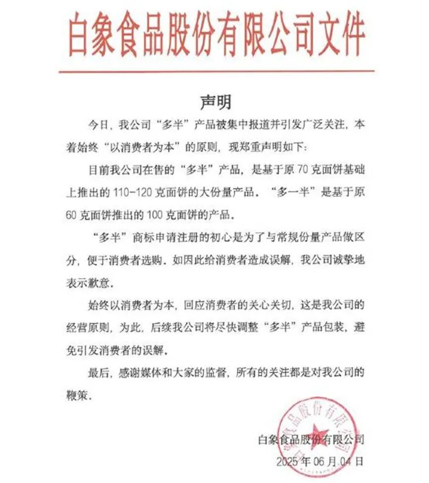 白象食品随后通过官方微博发布致歉声明,称“多半”是在70克的基础上推出的大分量产品,多一半是在60克基础上推出。商标申请注册的“初心”在于与常规分量产品做区分,便于消费者选购,并对由此给消费者造成的误解表示诚挚歉意,承诺将尽快调整“多半”产品包装。