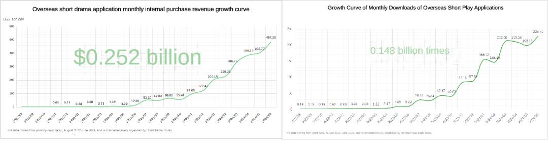 根据短剧自习室发布的《2024年短剧出海行业报告》,2022年8月到2024年6月期间,海外短剧应用总内购收入达到2.52亿美元,海外短剧应用累计下载量1.48亿次,内购收入金额和下载量整体呈增长趋势。