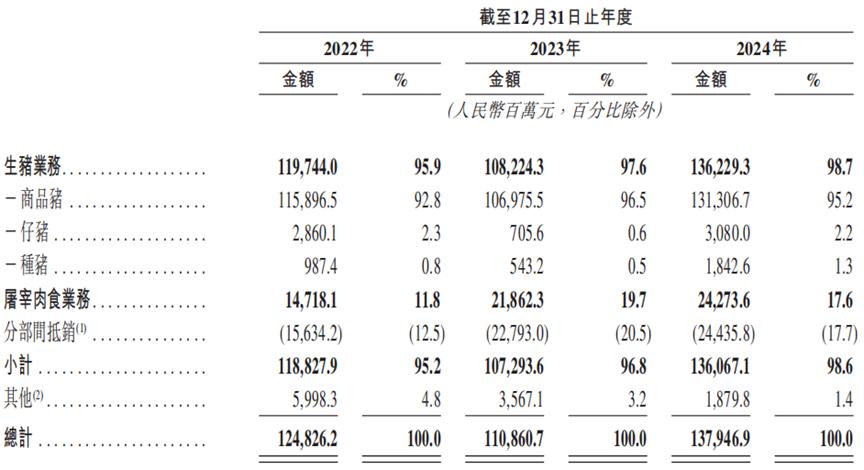 产品方面,公司主要销售生猪(即商品猪、仔猪及种猪)以及鲜、冻肉类产品,其中又以商品猪为主。2022年、2023年及2024年,来自商品猪的收入分别占总收入的92.8%、96.5%及95.2%。