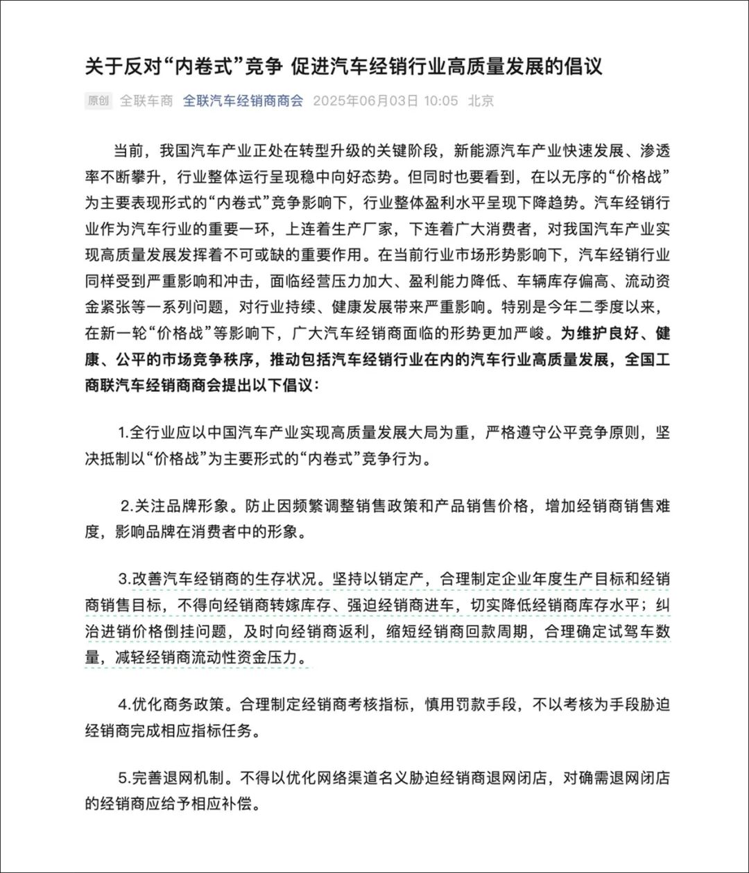 紧接着,全国工商联汽车经销商商会就现状又发布了《关于反对“内卷式”竞争 促进汽车经销行业高质量发展的倡议》,希望全行业能以中国汽车产业实现高质量发展大局为重,严格遵守公平竞争原则,坚决抵制以“价格战”为主要形式的“内卷式”竞争行为。