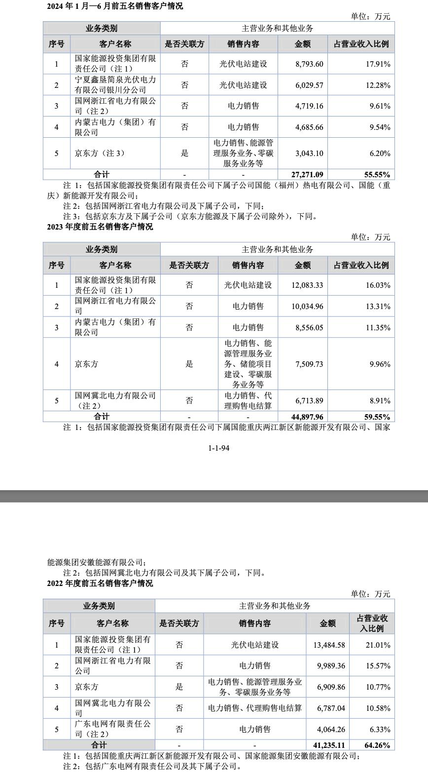 国家能源投资集团有限责任公司近年来一直是京东方能源的第一大客户,2022-2023年及2024年上半年,均在光伏电站建设上,为后者贡献约1.35亿、1.21亿、8793.60万元的销售收入,占营业收入比例的比例分别为21.01%、16.03%、17.91%。