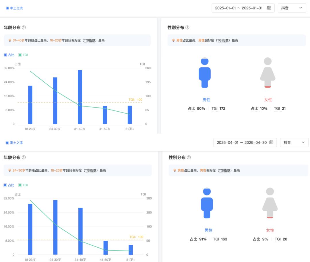 玩家——根据巨量算数的数据显示,可以明显看出,《率土之滨》在青春服上线(3月27日上线)之后,用户属性发生了明显的变化,从过去中年群体为主,导入了更多的年轻用户,很好的完成了《率土之滨》追求年轻化的目的。
