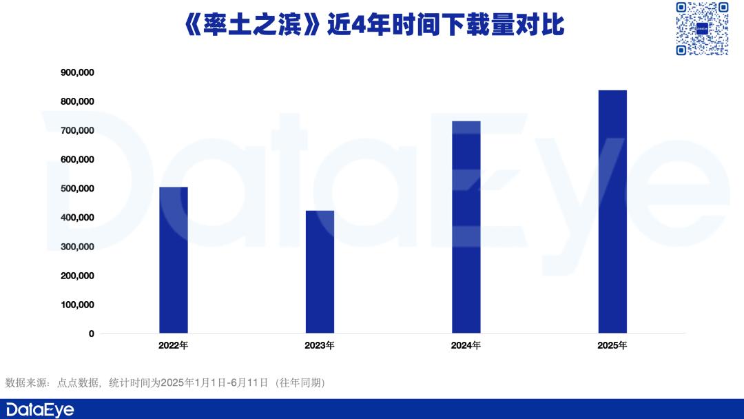 而把时间拉长,《率土之滨》今年以来的下载量与前几年相比,创下历史新高,且同比2023年增长100%,直接翻倍。