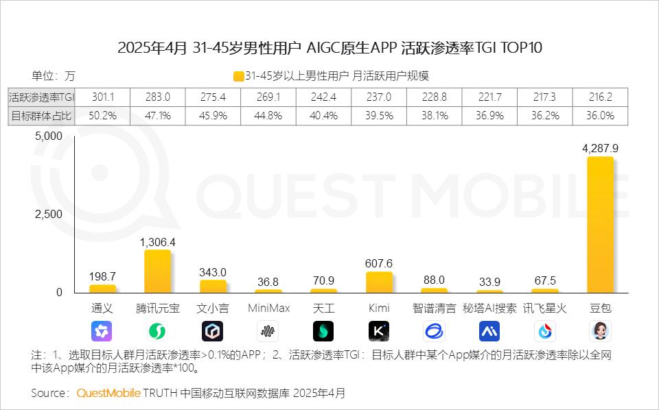 4、31-45岁男性用户已成为AIGC应用的核心使用群体,通义、腾讯元宝、文小言APP中,用户群体占比均超45%