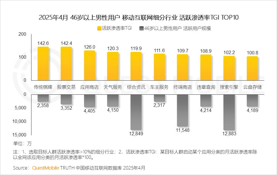 1、传统棋牌类游戏是中老年男性用户主要休闲方式,偏好浏览综合类新闻资讯内容,同时也经常使用天气服务、搜索引擎等工具类应用