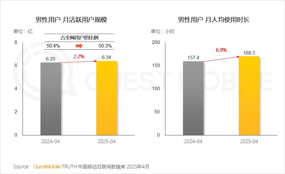 1、 男性用户群体的全网规模已突破6.34亿,月均使用时长显著增长,同比提升6.9%,达到168小时