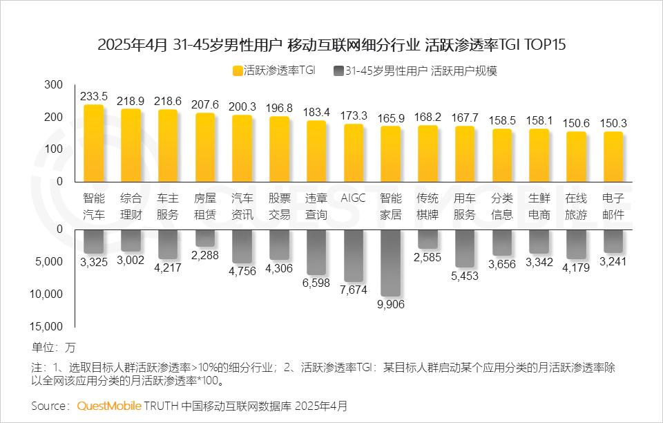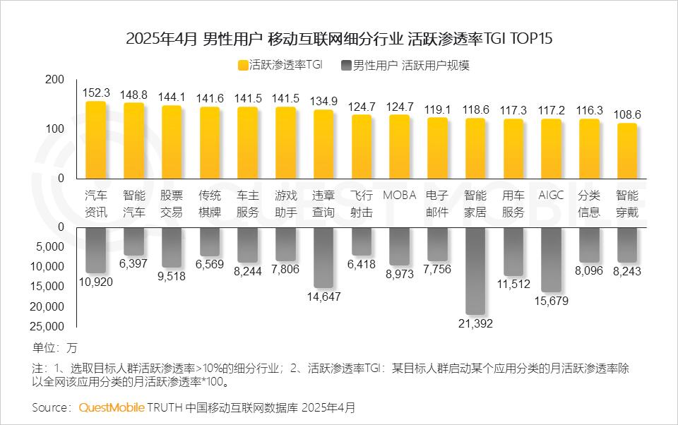移动视频和社交平台占据男性用户超六成的用网时长,其中视频平台的总使用时长增长了2.2%、社交平台则下降了1%,显示出男性用户的习惯迁移。在男性用户偏好的TOP15行业中,智能家居、AIGC、违章查询、用车服务、汽车资讯的活跃用户数位居前五,分别达到2.14亿、1.57亿、1.46亿、1.15亿、1.09亿,显示出男性在家庭、出行、汽车等方面承担了较大的责任。