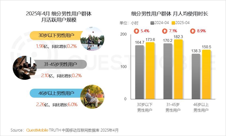 QuestMobile数据显示,30岁以下、31-45岁、46岁以上男性用户月人均使用时长分别达到173.6小时、182.3小时、150.5小时,其中46岁以上男性用户增速更快,同比增长率达到8.9%。