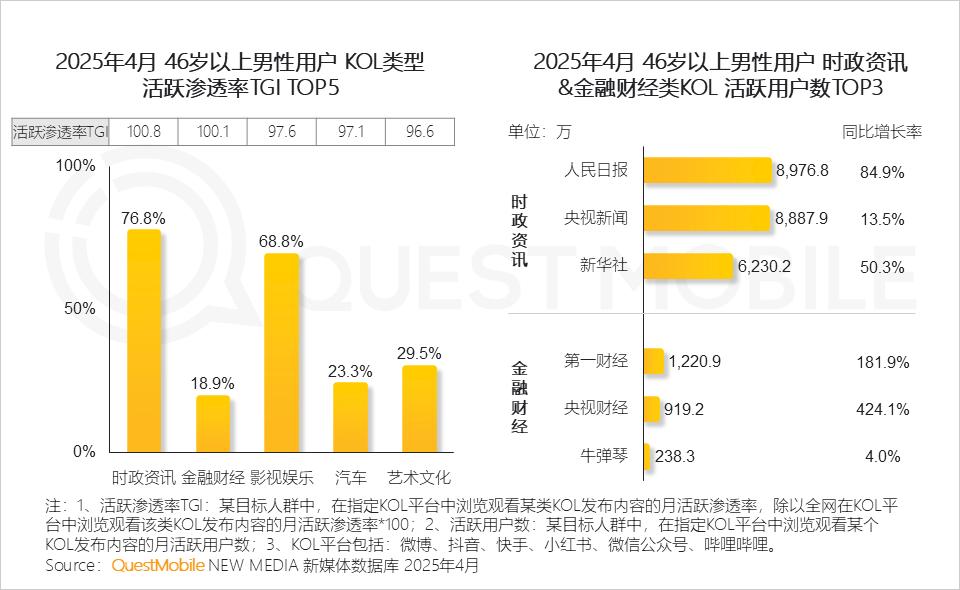 4、 短视频形式的新闻资讯同样受到中老年男性的欢迎,用户优先选择关注官方媒体账号,对时事政治、财经类内容表现出明显偏好