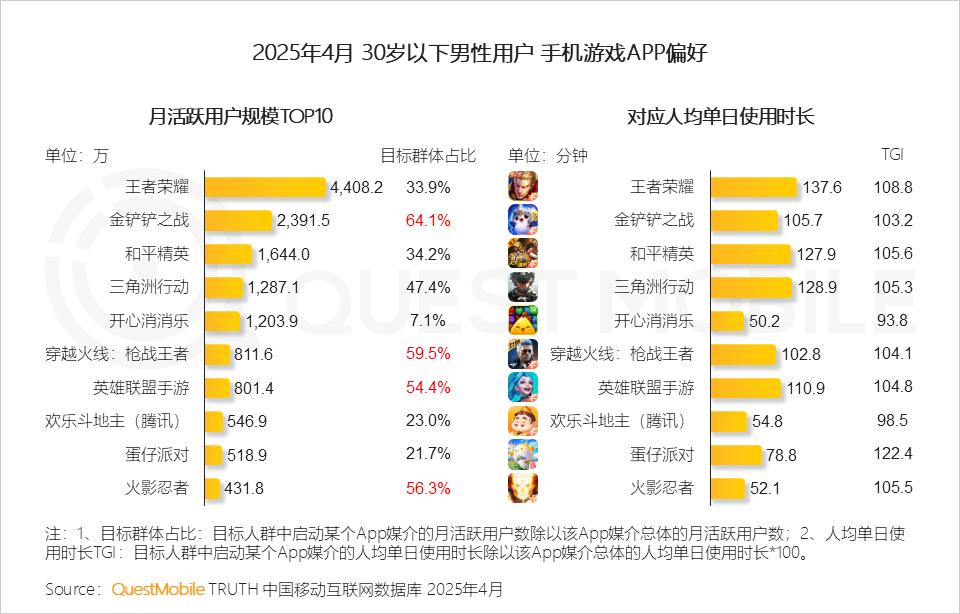2、《金铲铲之战》《穿越火线:枪战王者》等游戏的30岁以下男性用户占比超50%,TOP10榜单中,7款手游的单日使用时长超过1小时