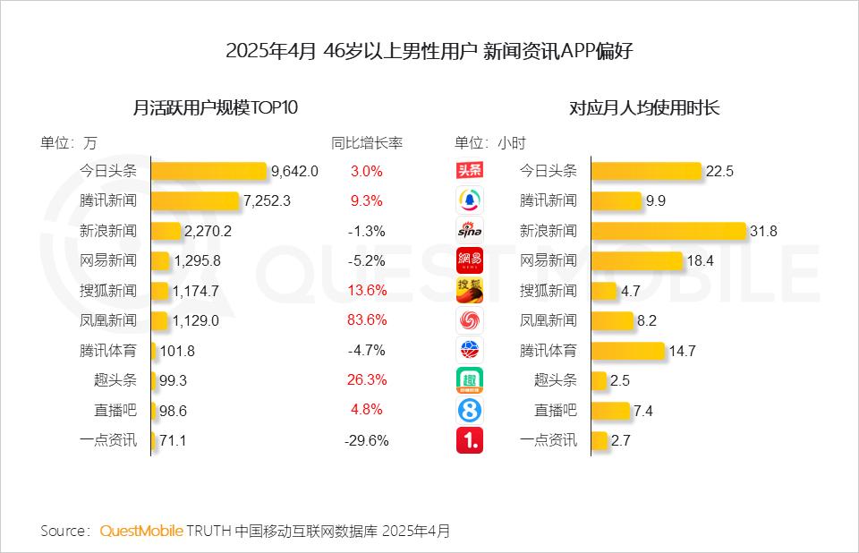 3、中老年男性用户的线上资讯阅读习惯正在深化,今日头条、腾讯新闻APP流量稳步增长,新浪新闻平台中的内容吸引力较强