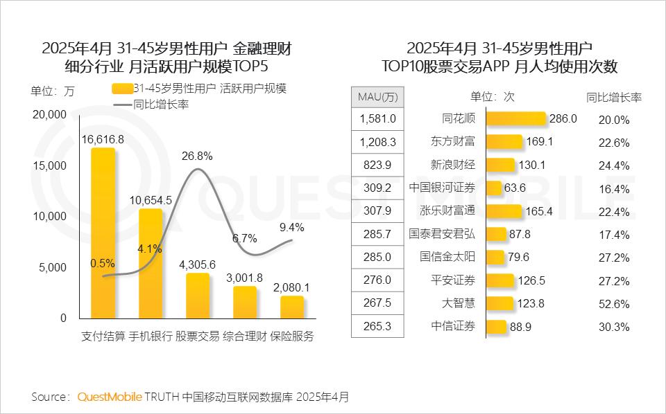 3、 中年男性有一定经济基础和资产积累,具有财富增值需求,是理财与证券投资的主力军,对交易平台的使用频率保持增长