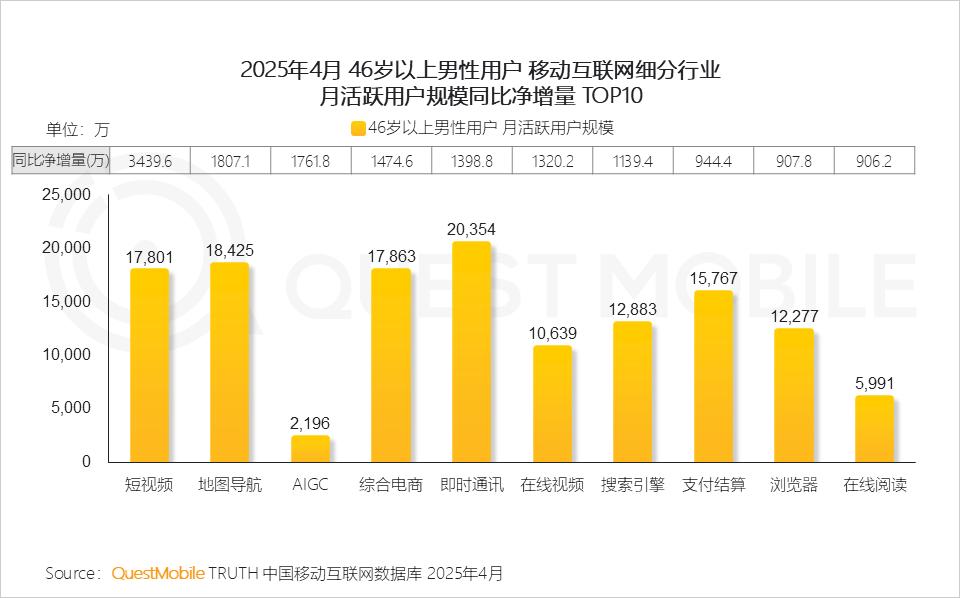 5、 从行业增量来看,46岁以上男性用户使用短视频APP的用户规模增长超3000万;同时,地图导航、AIGC 、综合电商等领域的用户增量也均突破千万