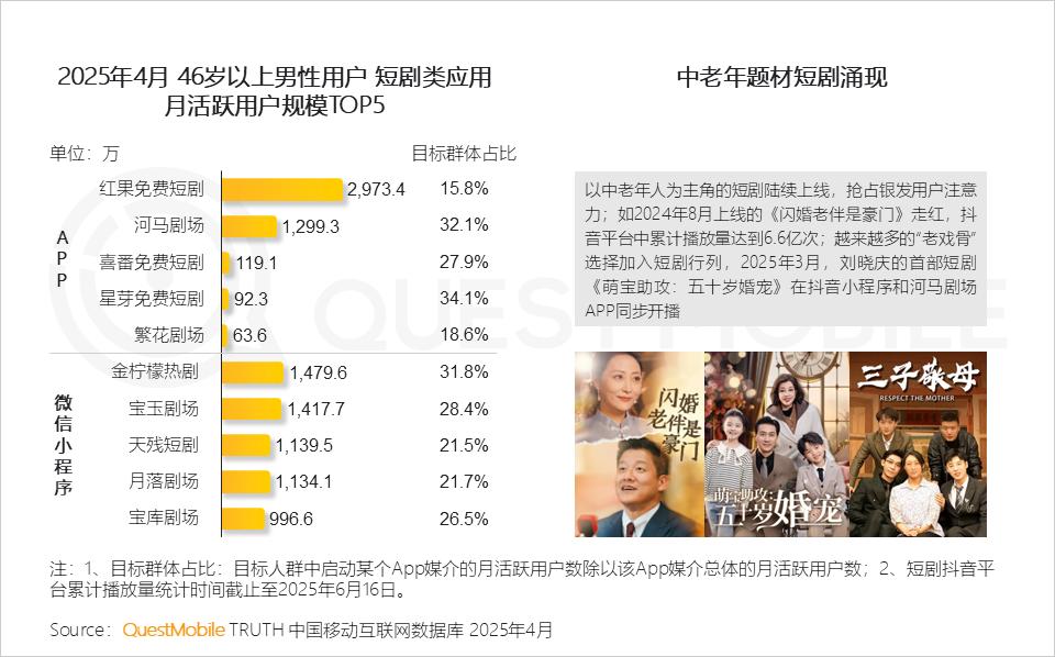 QuestMobile数据显示,河马剧场APP、金柠檬热剧微信小程序中46岁以上男性用户占比均超过三成。