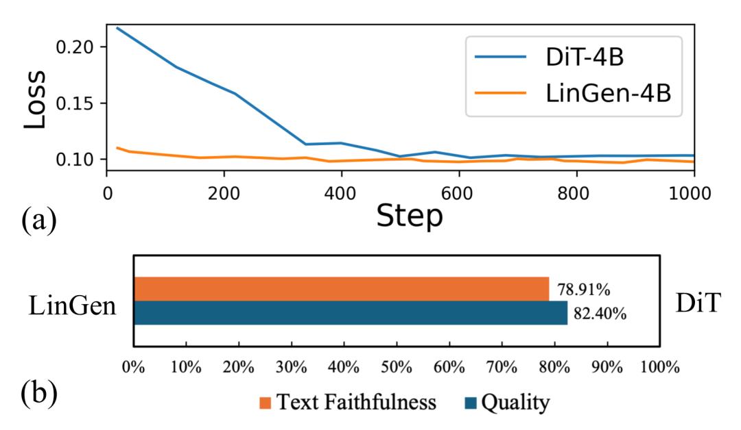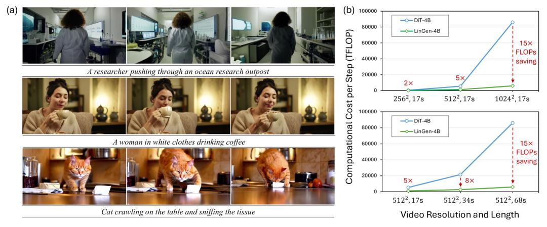 通常认为自注意力模块的线性替代是对完整自注意力的近似,虽然在速度上有显著优势,但在模型性能上往往略逊一筹,而LinGen打破了这个惯有的看法。
