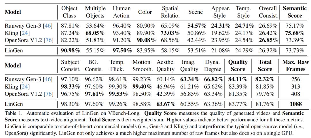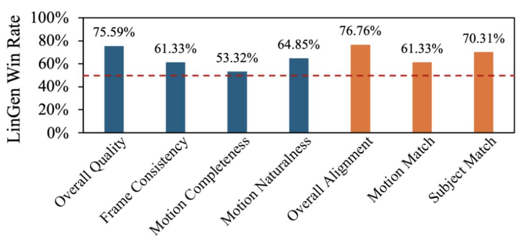 无论是人类评测的结果,还是在VBench上的自动评测的结果,都显示LinGen与先进的商业模型Kling、Runway Gen-3生成的视频质量接近,并且远胜于OpenSora v1.2。