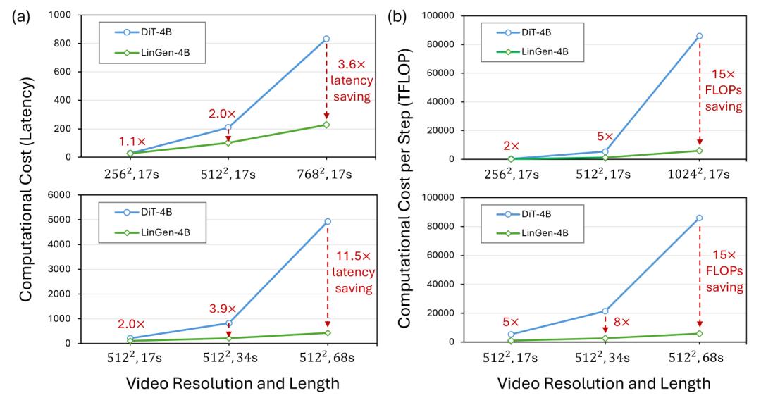 可以看到,在FLOPs方面,当生成17秒、34秒和68秒长度的512p视频时,LinGen-4B相对于DiT-4B分别实现了5×、8×和15×的加速;