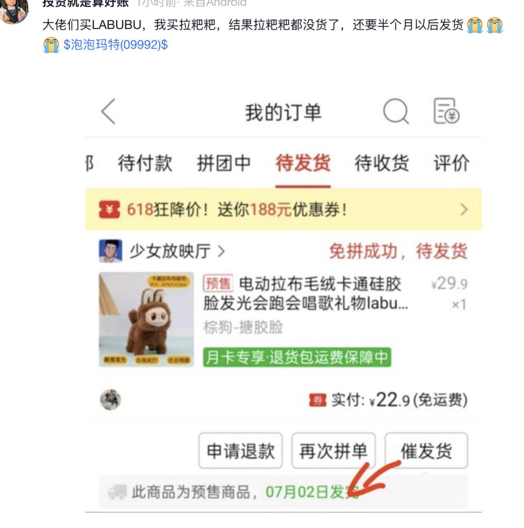 更有甚者,买Labubu、炒二手娃、买泡泡玛特股票三位一体,成了继“迪王”两位一体后,大众层面最受追捧的投资组合。
