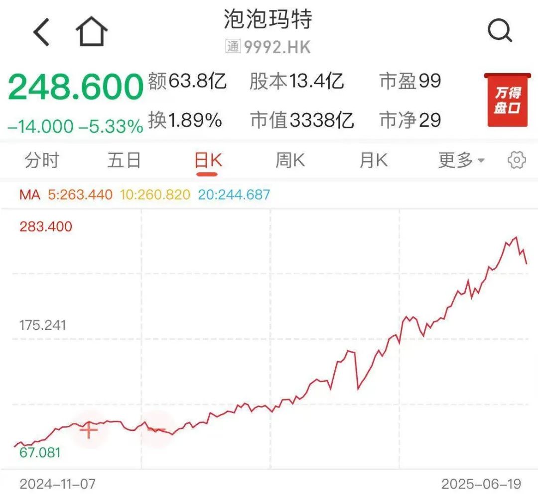 泡泡玛特的股价今年走势确实惊人。从去年底开始,泡泡玛特高管多次高位套现,市场不断质疑其市值是否撑得住,但仍然没有影响这支股票的走势。