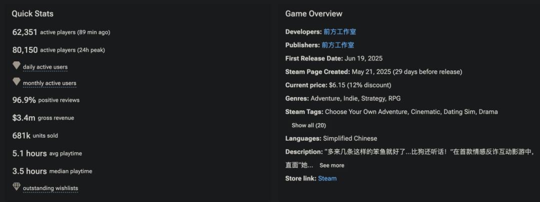 在热度的推动下,《捞女游戏》的销量一路狂飙。根据专业机构VG Insights的预估数据,截至6月25日,其总销量已超过68万,收入超过340万美元,约合人民币2440万元。对于一款原本小众的互动影游来说,这无疑是一个惊人的成绩。从商业角度看,游戏似乎取得了巨大的成功,制作团队在短期内获得了丰厚的利润。