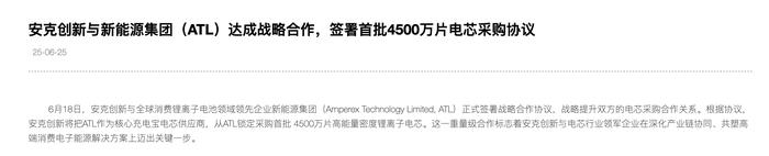 6月25日,安克创新官宣与ATL达成电芯采购合作。(图源:安克创新)