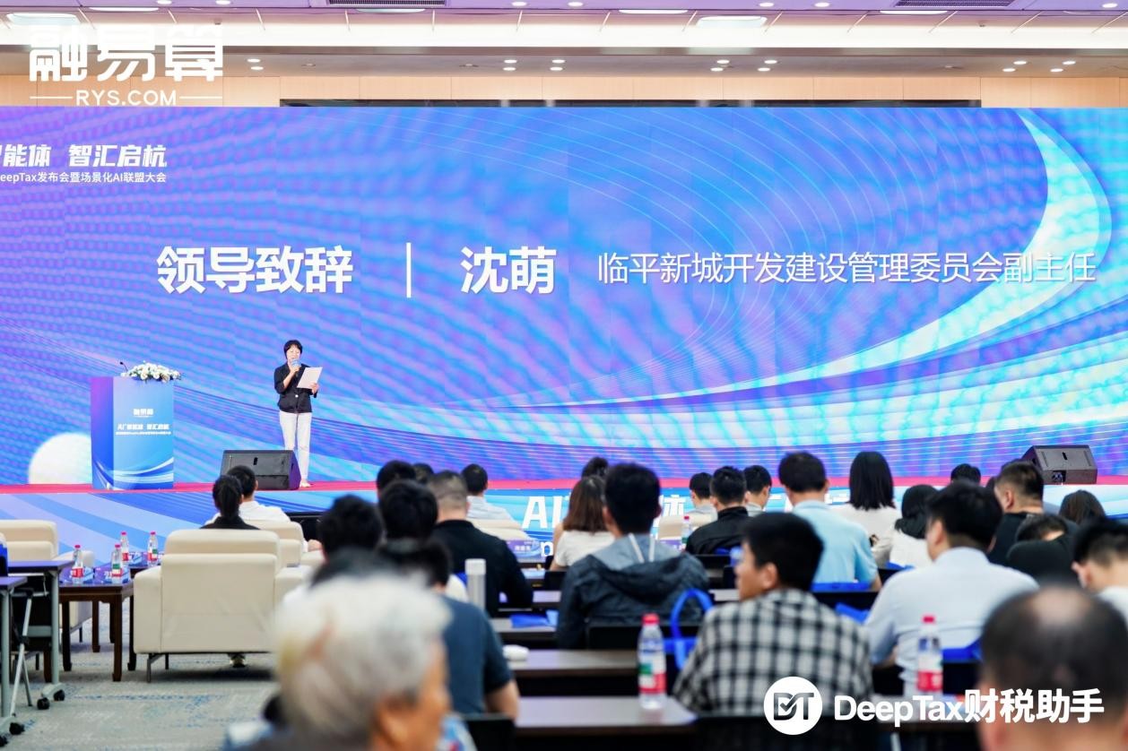 沈萌首先致辞。她对与会代表莅临临平表示热烈欢迎。她说,临平作为杭州数字经济的重要引擎,始终以开放姿态拥抱科技变革。我们打造算力小镇,不仅为企业提供前沿算力资源,更希望构建“政产学研用”深度融合的创新生态,让技术成果加速转化为发展动能。今天这场盛会,正是我们推动AI产业发展的又一里程碑。DeepTax财税AI产品的发布,标志着AI技术从概念探索迈向深度赋能实体经济的新阶段。这不仅是融易算创新实力的体现,更是临平鼓励企业突破、支持技术落地的生动实践。我们期待这款产品能为更多行业带来效率革新,成为企业数字化转型的得力助手。临平将持续优化服务,用政策支持、产业配套和人才保障,为企业发展保驾护航。