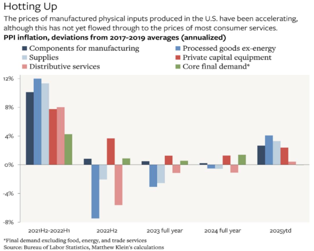 那么,接下来要思考的问题很重要,关税是否真会影响到物价,并持续产生影响吗?从目前数据来看,PPI一些核心项目已有上窜的趋势,只是目前还没有走到消费者物价当中。