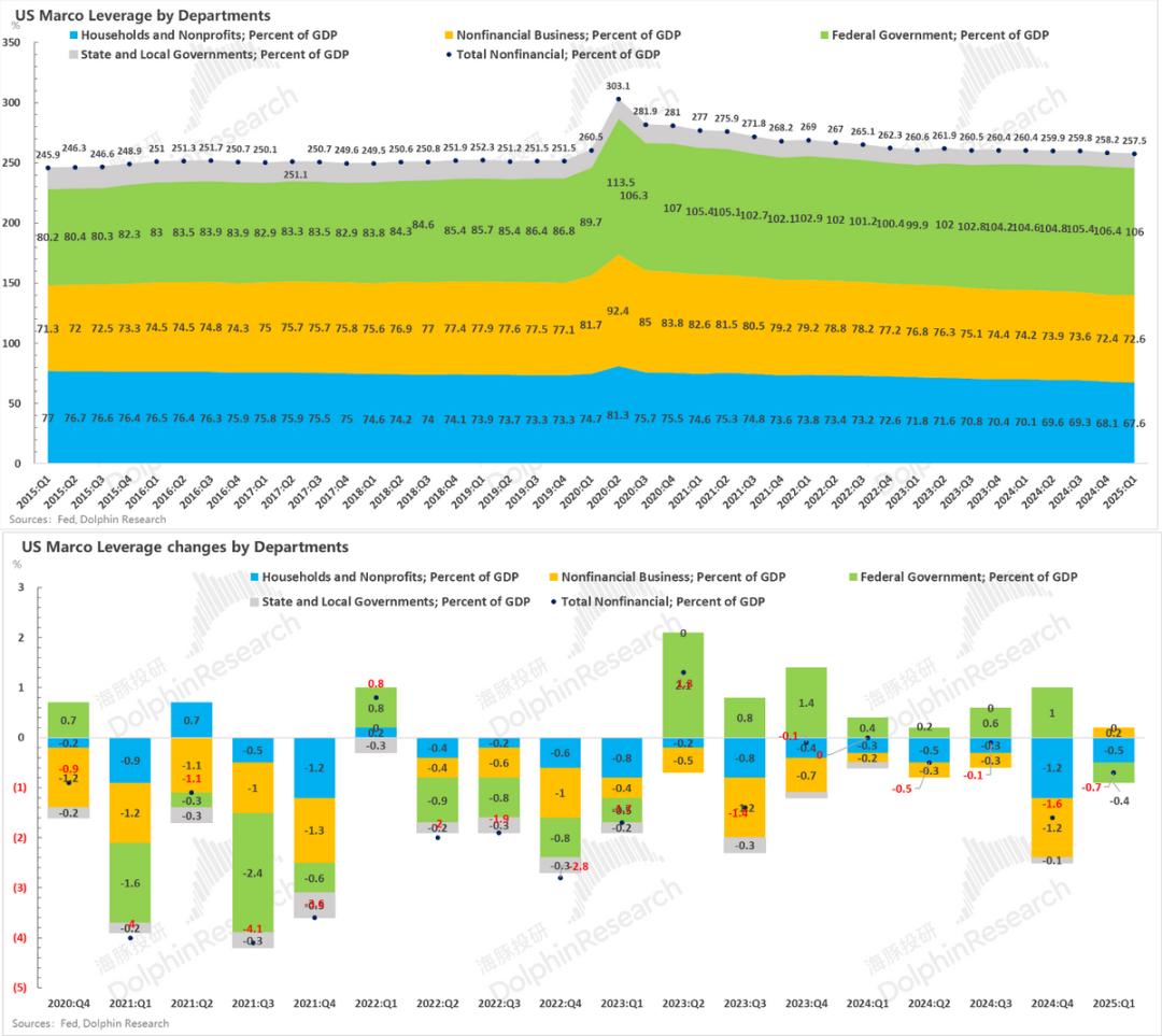 a. 他上任之后的2025年一季度就终结了联邦政府连续七个季度加杠杆的操作,一季度美国联邦政府的杠杆终于降下来了;