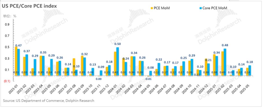 从月环比趋势来看,关税政策影响明显非常大,4月2日解放日前,因为提前囤货,3月份居民消费支出环增爆棚,接着4月份基本就停滞了,5月份更是环比负增长近0.3%。