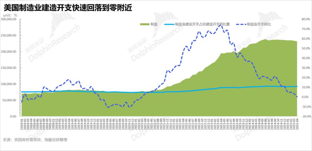 b. 拜登经济学下,靠产业刺激法案出现的制造业建造支出(制造业产能建设)也达峰,最近半年基本持续走在下坡路上。