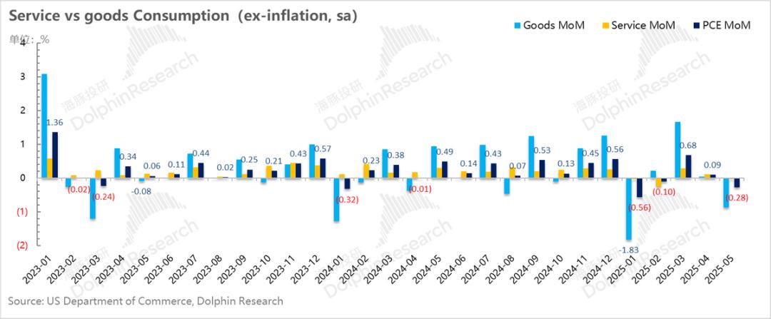 从分项来看,耐用品消费下滑明显,但关键是一直坚挺、和关税关系不大的服务消费也转为负增长了。这里面已经明确了,即使没有关税影响,居民消费也再转弱的信息。