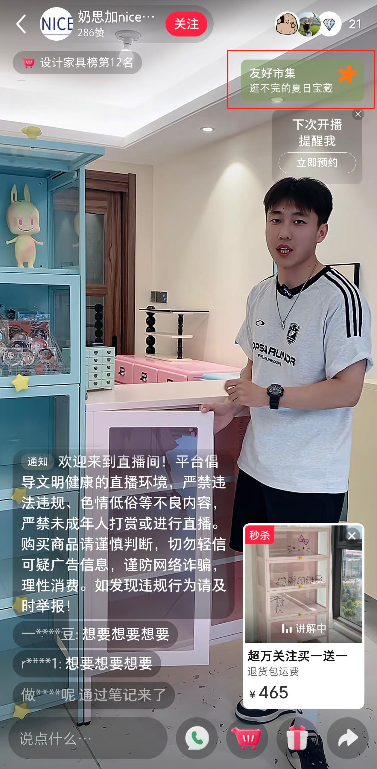 但在加入「友好市集」后,「奶思加nice家居」能够将认证标签转化为信任资本。「为什么那么多铁皮柜大商家在传统电商那么牛,进了小红书却玩不转?我们一个后来者凭什么能做到直播间300人同时在线?说到底,还是在用料和品质上真下了功夫。」