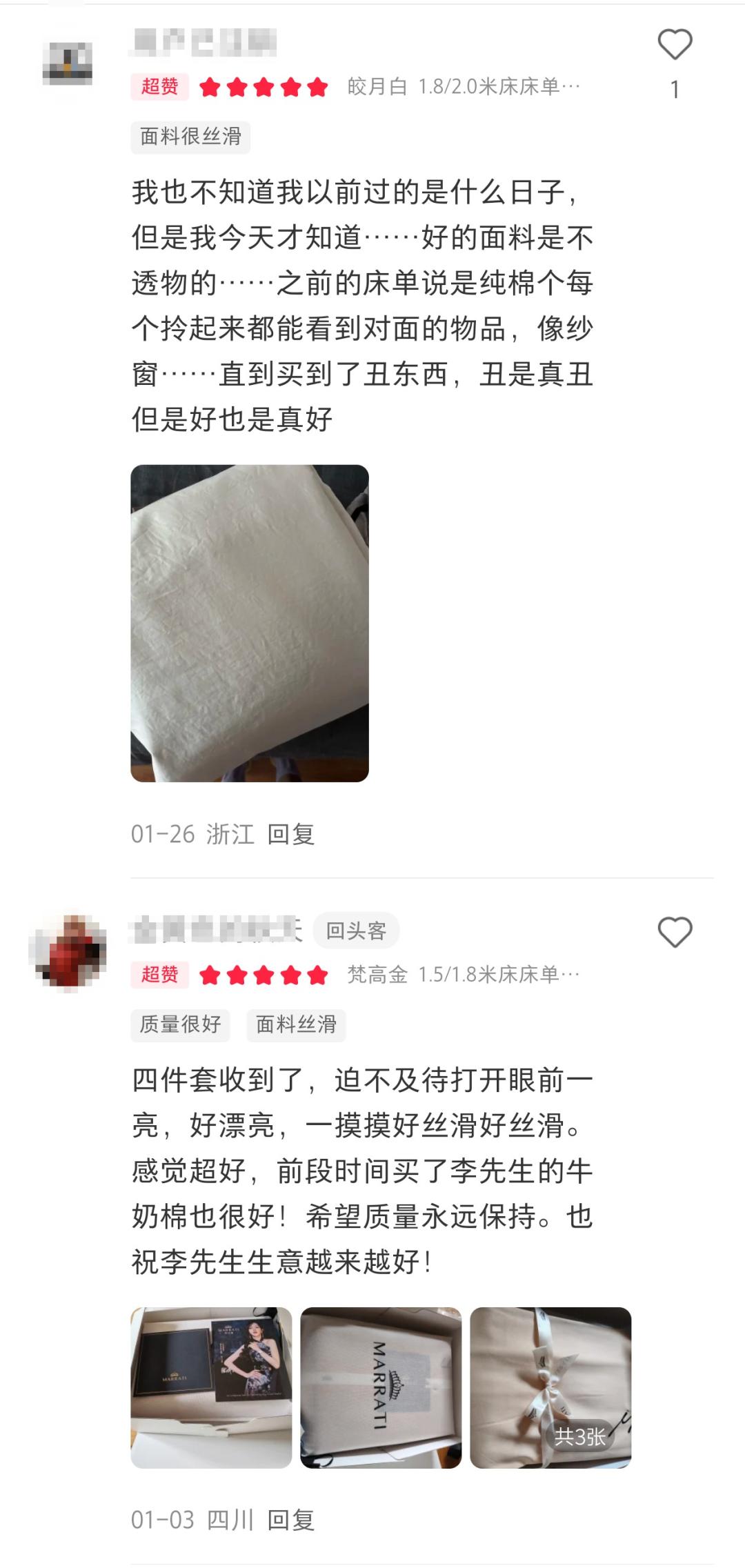 正是在这种理念下,店铺在活动期间主推的一款「丑东西」床品,跑到当月加购第一名。在主理人笔记中,这款产品卖点是高光泽度长绒棉、YKK拉链等元素,反映到评论区,画风是这样的:「丑是真丑,但是好也是真好」「丑东西其实是真正的好东西,放心冲」……
