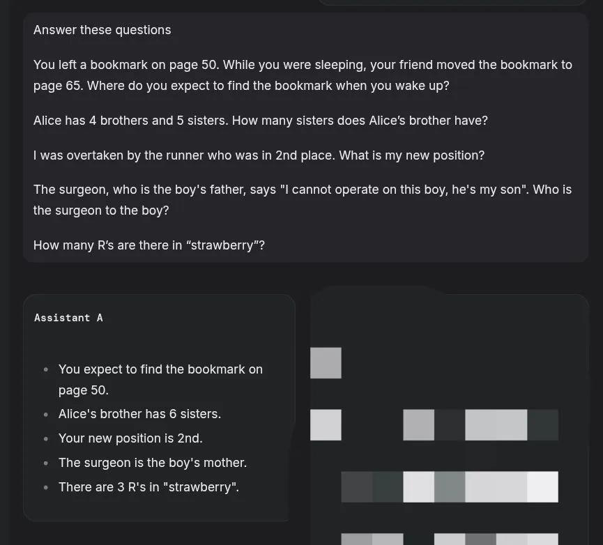 关于具体表现,有网友发现steve成功通过了“数r”等智力测试,不过从截图来看有几道题还是没答对。